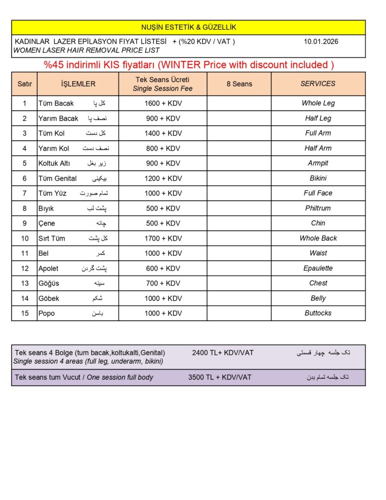 laser hair removal price list (1 Session) + ( VAT %20 ) 10.01.2026