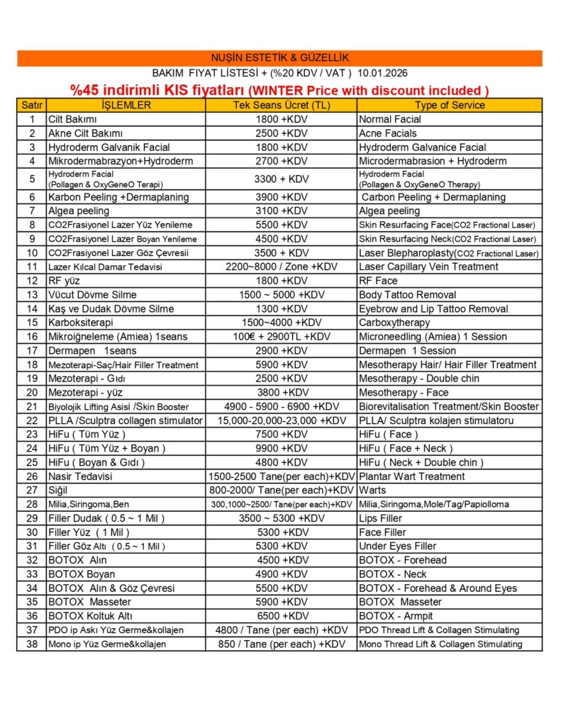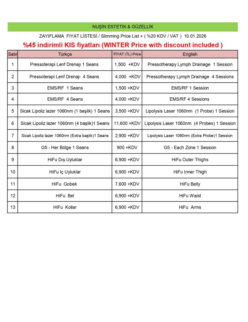 Slimming price list + ( VAT %20 ) 10.01.2026